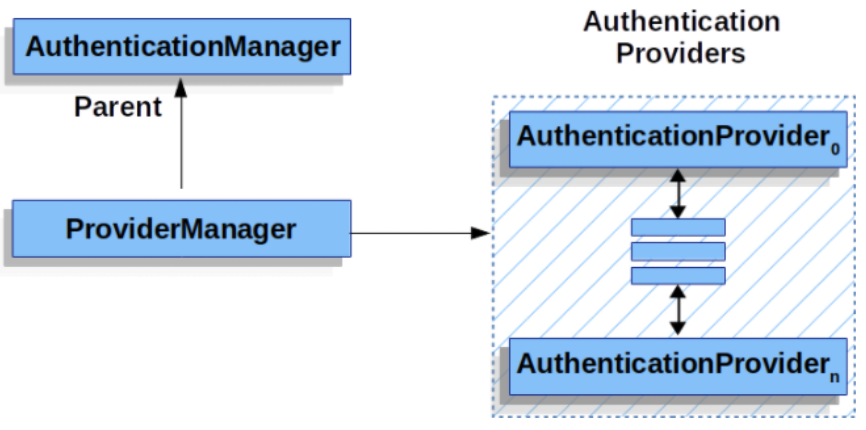 위 사진을 보면 하나의 ProviderManager에는 여러 AuthenticationProvider를 갖고있다. 이는 Spring Security에서 다양한 인증 방식을 지원하기 때문에 각각의 인증 방식에 따라 다른 AuthenticationProvider가 필요할 수 있기 때문이다.