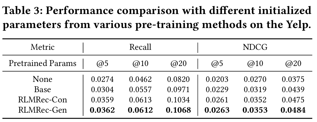 - 목적 : Pre-training 기술로서의 RLMRec의 잠재력을 탐구한다.