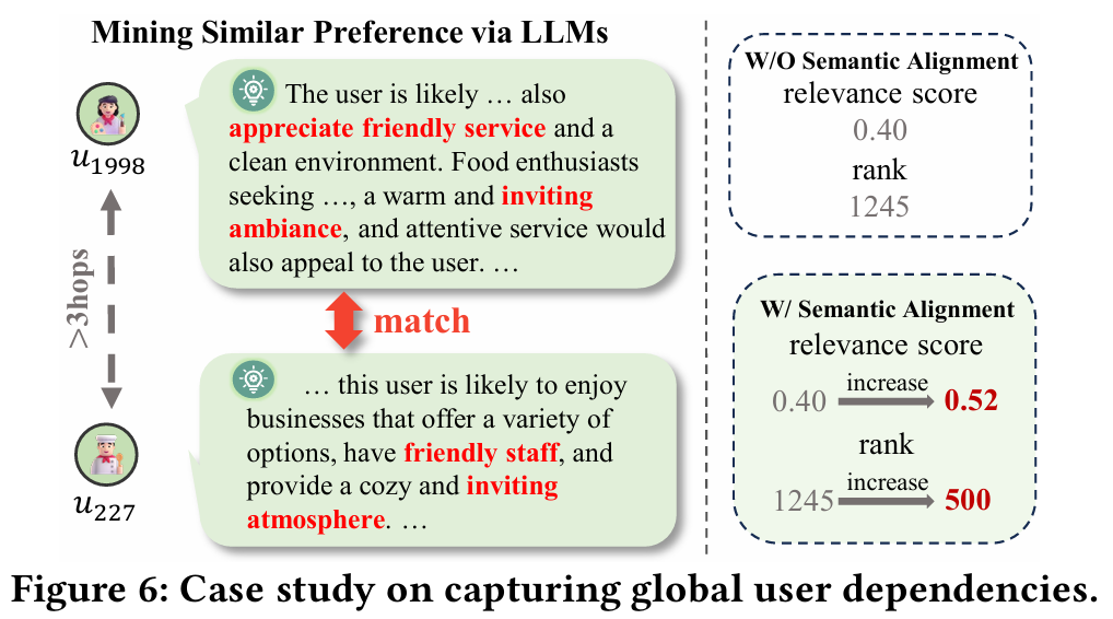 - u1998과 u227 간의 공유 관심사 같은 LLM에서 파생된 의미 정보(e.g. 친절한 서비스)를 통합함으로써 관련 점수와 순위가 증가하는 것이 관찰된다.
