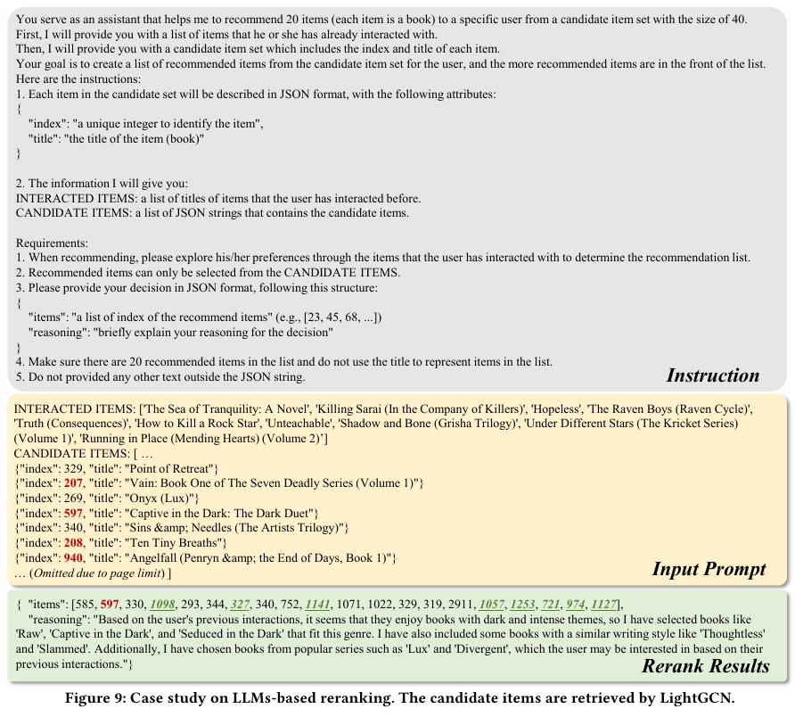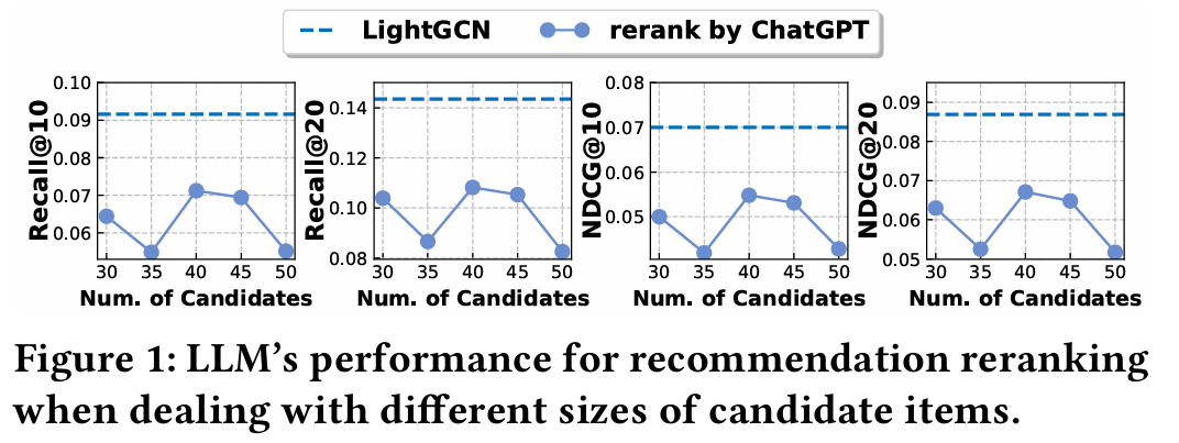 - LightGCN으로 선별한 40개의 아이템을 LLM으로 re-rank 한다.