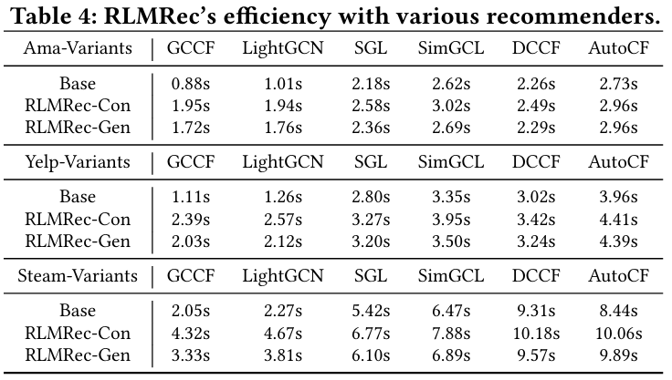 - MLP에 대한 시간 복잡성은 RLMRec-Con과 RLMRec-Gen 모두 O(N×ds×de)이다.