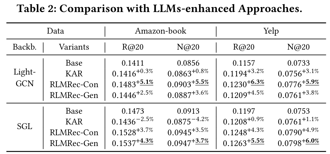 - RQ2 : LLM-enhanced semantic 표현이 추천 성능 향상에 기여하는가?