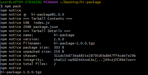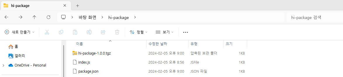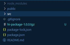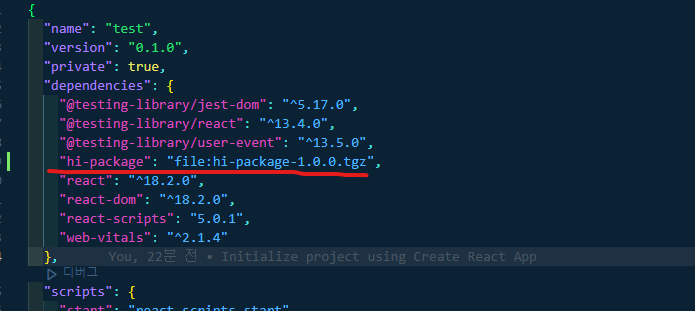 npm install hi-package-1.0.0.tgz을 입력해 생성한 package를 설치한다.
