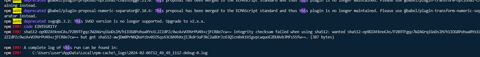 혹시나 하는 마음에 npm cache clean --force를 실행하고 다시 pm ci를 했더니 드디어 verify integrity fail 에러를 만날 수 있었다..!