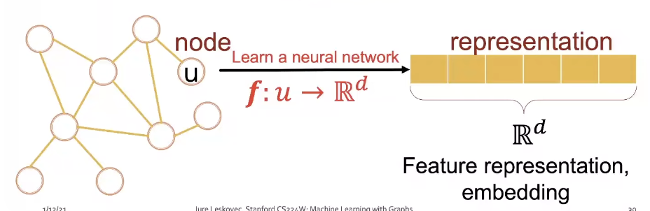 - Representation Learning : Map nodes to d-dimensional embeddings such that similar nodes in the network are embedded close together