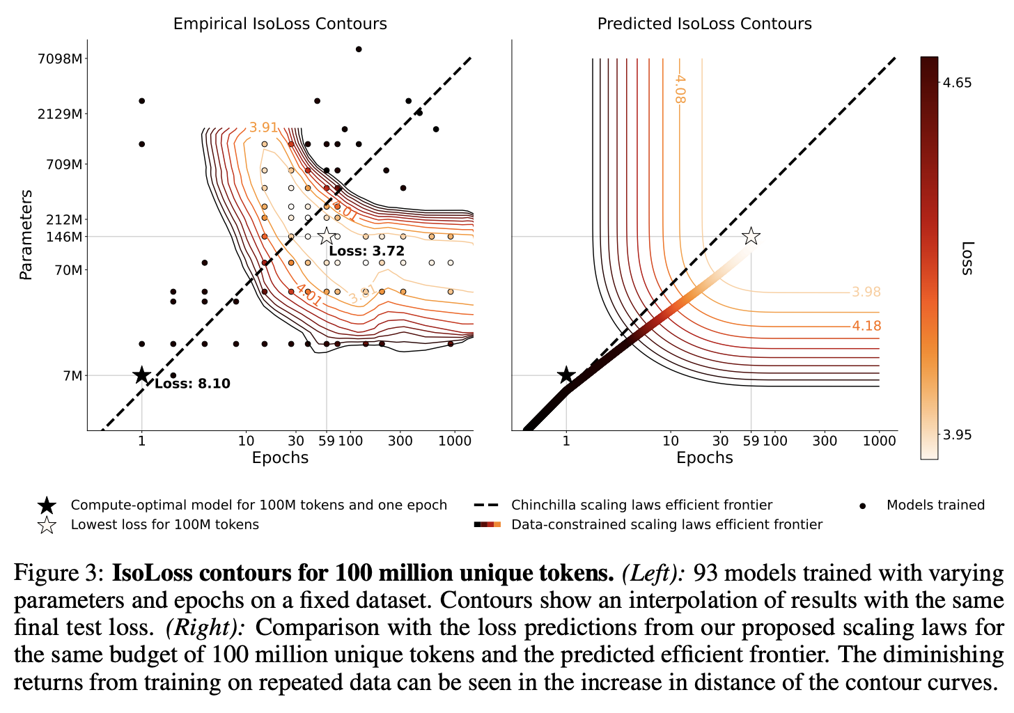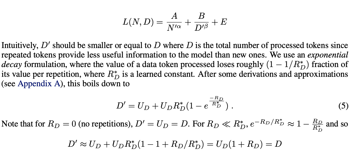 - 손실함수 수정: 기존의 손실 함수를 수정하여 반복되는 데이터와 매개변수의 효과적인 활용을 고려한다. 새로운 스케일링 법칙은 반복되는 데이터가 줄어드는 가치와 모델의 매개변수가 초과할 경우 발생하는 감소 효과를 모델링한다.