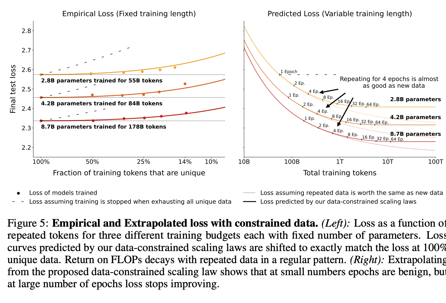 - 데이터 반복의 가치 평가: 데이터가 제한적일 때, 동일 데이터를 여러 epoch에 걸쳐 반복하여 사용하는 것의 효과를 평가한다. 이를 위해 반복 데이터의 효율성을 측정하는 새로운 스케일링 법칙을 도입한다.