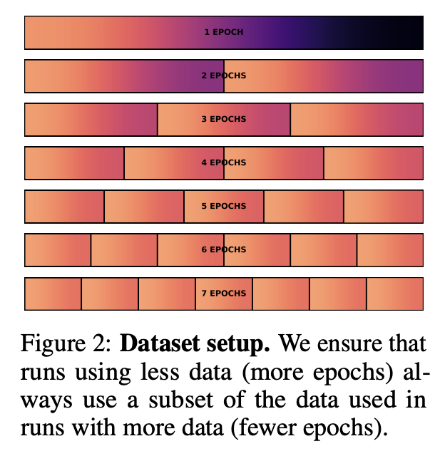 - 데이터 제약: 고정된 데이터 예산 (100M, 400M, 1.5B tokens), 이를 기반으로 다양한 parameter 크기와 epoch 수를 가지는 모델을 훈련