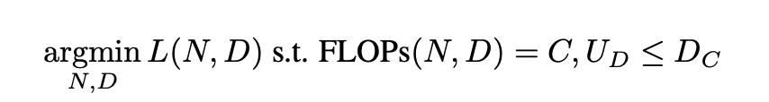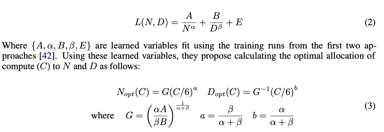 - 손실을 최소화하기 위한 constraint을 효율적으로 할당하는 문제를 수식으로 정의한다. 이 과정에서, parameter와 training tokens 사이의 최적의 균형을 찾는 것이 중요하다.