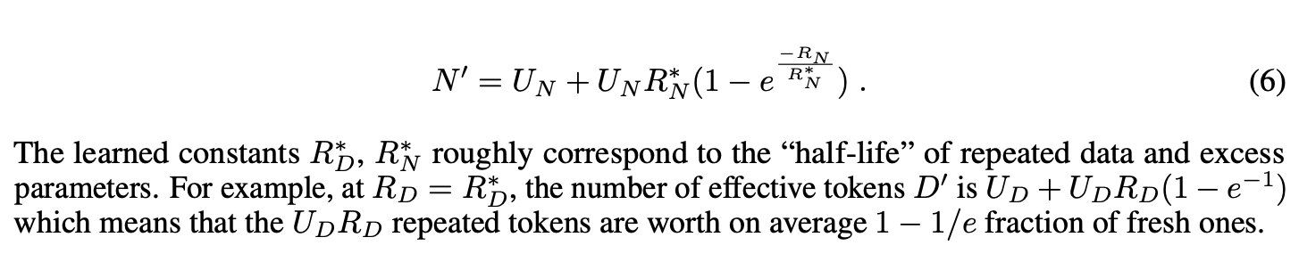 - 효과적 데이터와 매개변수: 반복되는 데이터의 가치가 시간이 지남에 따라 감소하는 것을 모델링하기 위해, 새로운 스케일링 법칙은 효과적 데이터와 매개변수의 개념을 도입한다. 이는 반복 횟수에 따라 조정되면, 초기 유니크 데이터 사용에 최적화된 매개변수 수를 계산하는 데 사용된다,