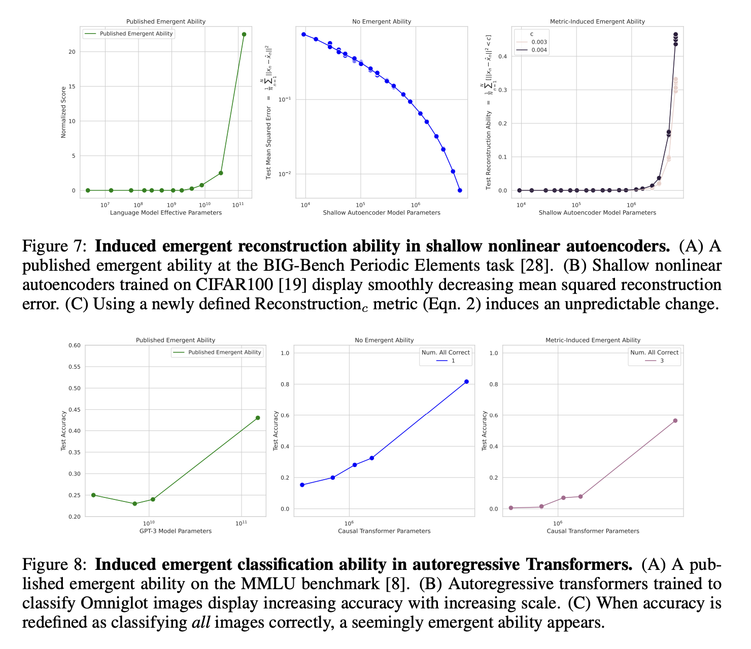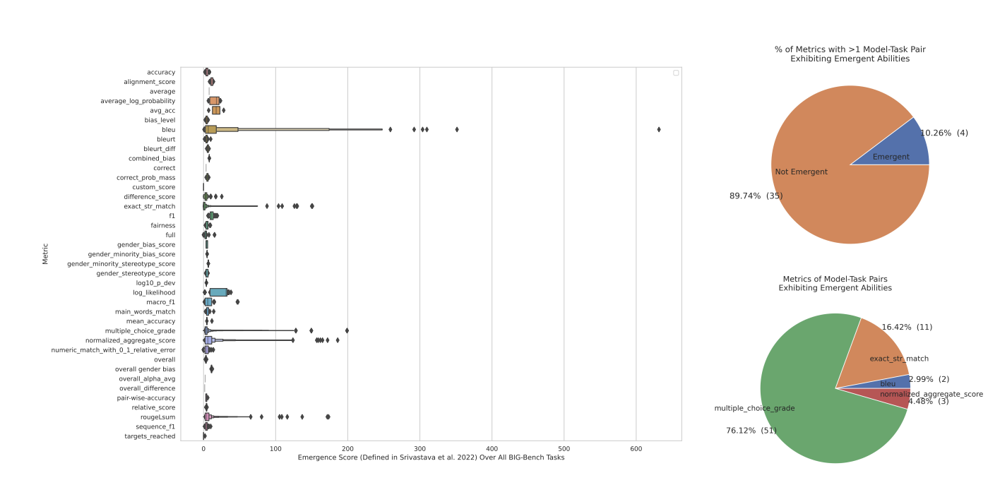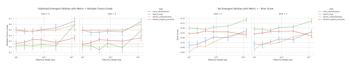 대규모 언어 모델의 성능은 일반적으로 모델 크기가 커짐에 따라 부드럽고 예측 가능하게 개선된다. 이는 Neural scaling laws과 일치하는 관찰이다. 하지만, 연구자가 사용하는 특정 지표는 이러한 부드러운 변화를 급격한 변화로 오해하게 할 수 있다.