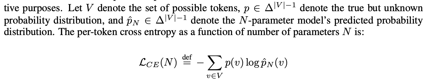 그림의 A에서 각 모형의 토큰당 교차 엔트로피가 거듭제곱 법칙으로 떨어진다고 가정