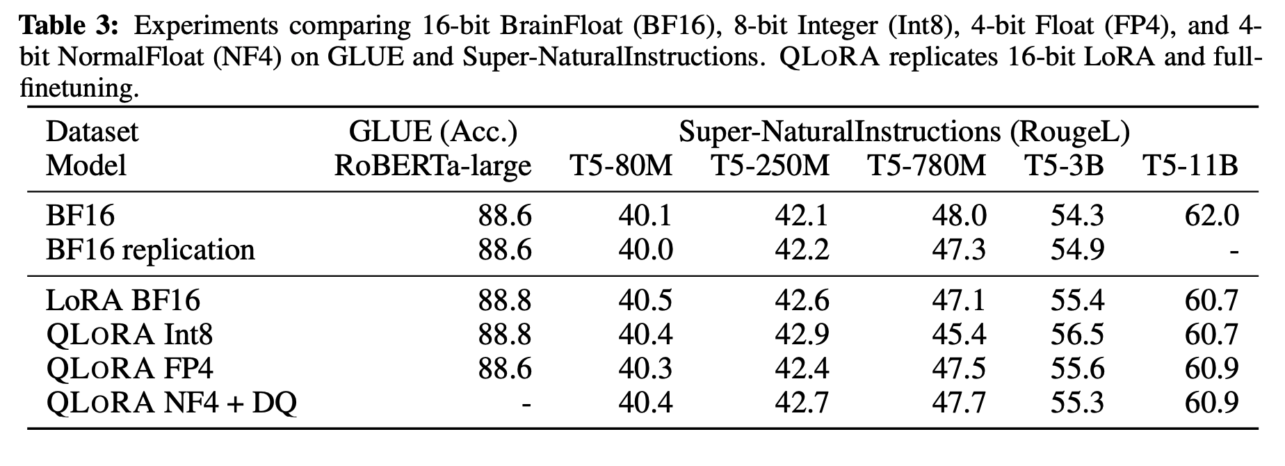- GLUE benchmark & Super-NaturalInstructions dataset : QLoRA의 일반화 및 instruction following 성능을 평가한다.