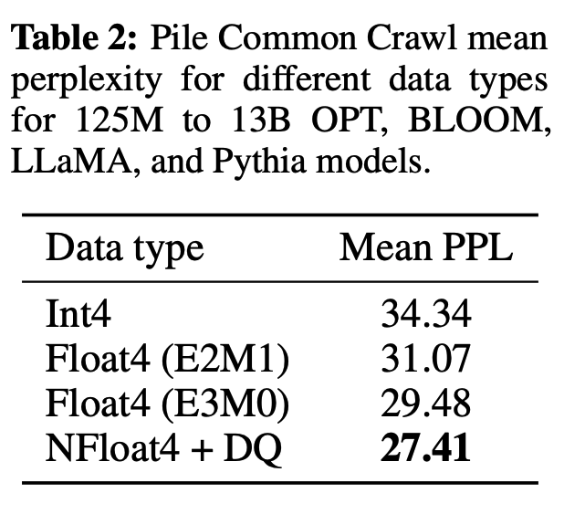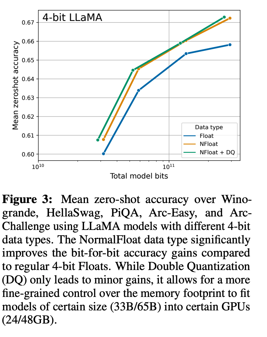 - NF4 양자화를 표준 4-bit 정수 또는 부동소수점 양자화 방법과 비교하여 성능을 평가