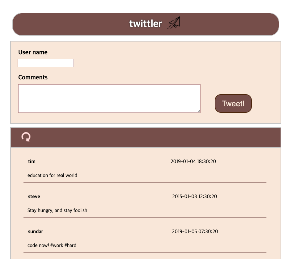 드디어 트위터 목업(Mock-up) 해둔 HTML에 DOM으로 조작해서 기능을 구현해주는 과제를 수행했다. HTML에 하드 코딩해서 만들어준 트윗 리스트를 지우고 JS로 함수를 만들어 DATA.js에 만들어져 있는 배열의 요소를 가져와 트윗 리스트를 생성해 주었다. 이 과정만 거의 2시간이 걸렸다. 그리고 username을 쓰고 comments를 써서 Tweet!을 누르면 새로운 트윗이 생성되도록 작업을 해주었다. 그리고 update button(원 모양 화살표)을 누르면 랜덤으로 정보를 가져와 트윗이 생성되는 작업까지 해주었다. 그런데 이미 생성되어있는 트윗에 username(ex: tim, steve)을 눌러서 그 사람이 쓴 트윗만 보이게끔 하는 기능을 구현하려고 하다가 여태 했던 작업이 전부 꼬이는 상황이 발생했다. 문제는