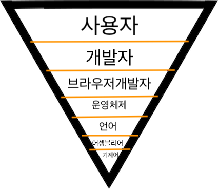 ex) 사용자 -> 웹 개발자 -> 브라우저 개발자(chrome) -> 운영체제 개발자(macOs) -> 프로그래밍 언어 개발자(Java Script) -> 어셈블리어(기계어와 일대일 대응이 되는 컴퓨터 프로그래밍의 저급 언어) -> 기계어(컴퓨터(CPU)가 별다른 해석(컴파일) 없이 읽을 수 있는 프로그래밍 언어. JS가 브라우저를 제어하듯이 기계어는 CPU를 직접 제어한다.)