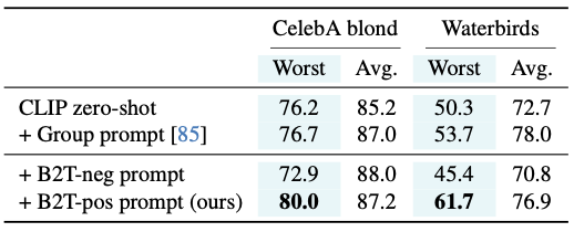 B2T 키워드 중에 앞서 구한 CLIP score를 가지고 B2T-pos(ex: “ocean”), B2T-neg(ex: “bird)를 [group]에 대입하여 실험한 결과 positive 키워드를 사용했을 때 worst-group accuracy, average accuracy 모두 향상되었고, 반대로 negative 키워드를 사용했을 때는 오히려 성능이 나빠진 것을 알 수 있다.
