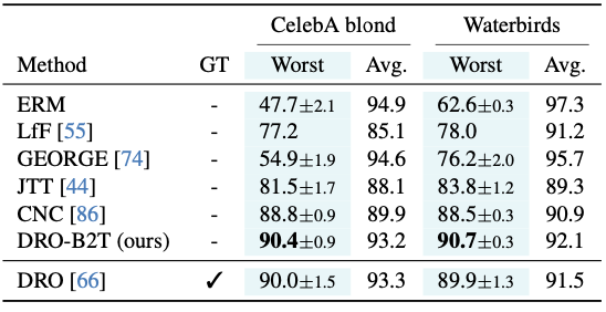 ground-truth bias가 존재하는 CelebA, Waterbirds에 대해 기존 방법들과 비교 분석