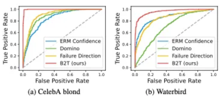 (ERM) CelebA의 Blond 클래스에 대해 B2T가 “man” 키워드를, Waterbirds에 대해서 “forest”, “ocean”을 포착하여 성별, 배경 편향을 찾아냈을 뿐만 아니라 기존의 background annotation인 “land”에 비해 더 정확한 keyword인 “bamboo”를 찾아냄