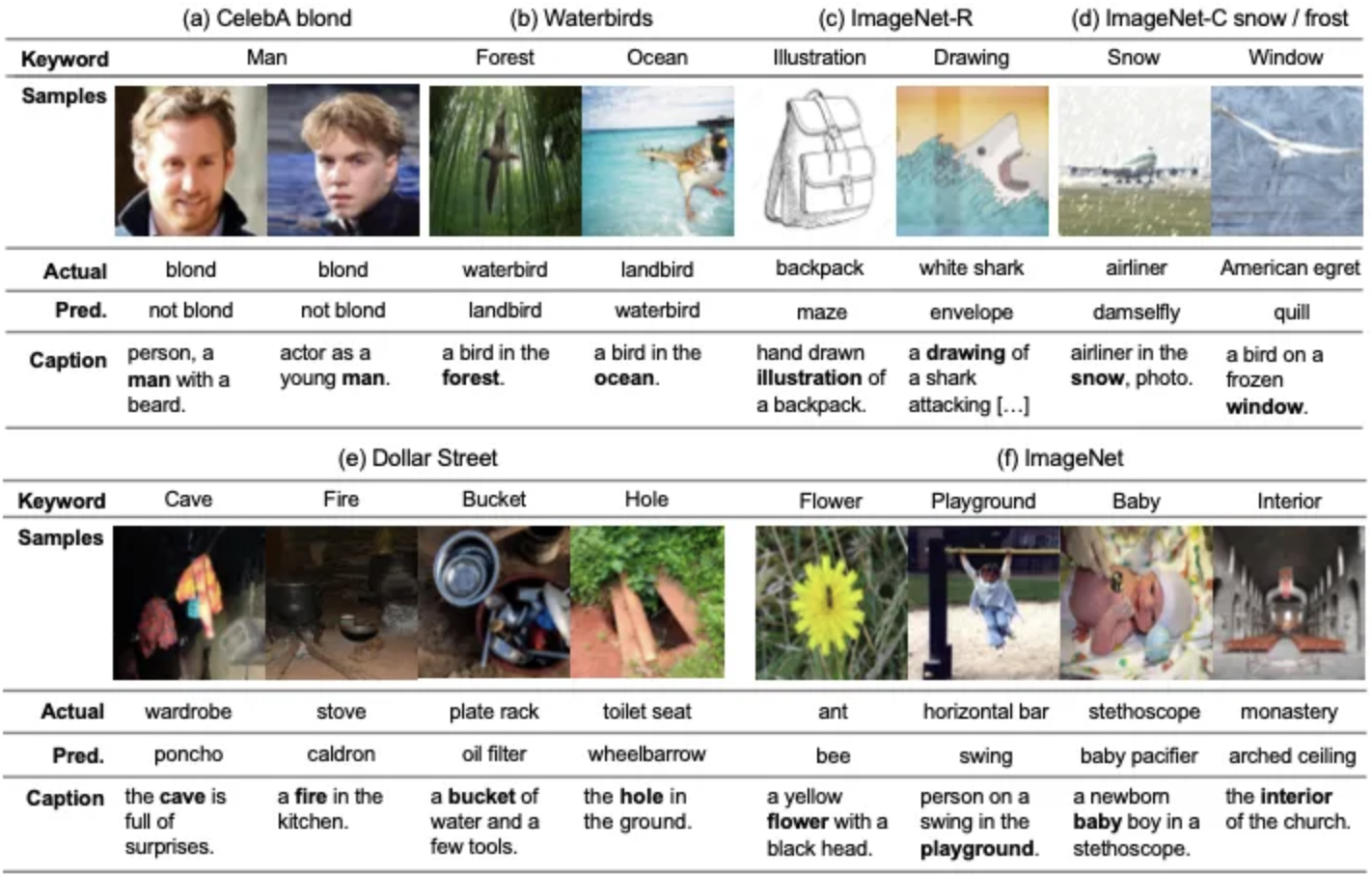 새로운 bias도 찾아냄 ⇒ 꽃(flower)이 포함된 image에서 개미(ant)를 벌(bee)로 오인- 이렇게 찾아낸 bias keywords를 가지고 DRO와 같은 편향 제거 훈련에 이용하거나, CLIP prompting에 적용하거나, 다른 모델과 비교할 수 있음. 또한 잘못된 레이블을 검출할 수도 있음