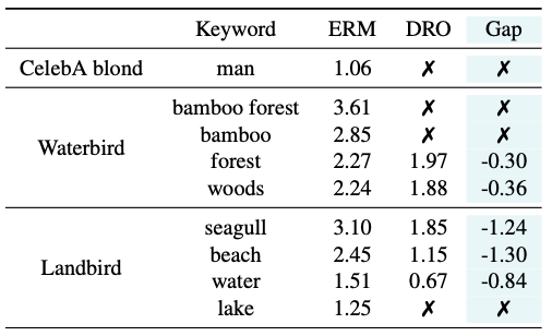 DRO는 편향 키워드를 줄이거나 거의 완전히 제거에 성공하였음, CelebA blond에서 “man” 키워드가 사라졌고 Waterbirds에서 “seagull”의 CLIP 점수가 3.10에서 1.85로 감소하였음.