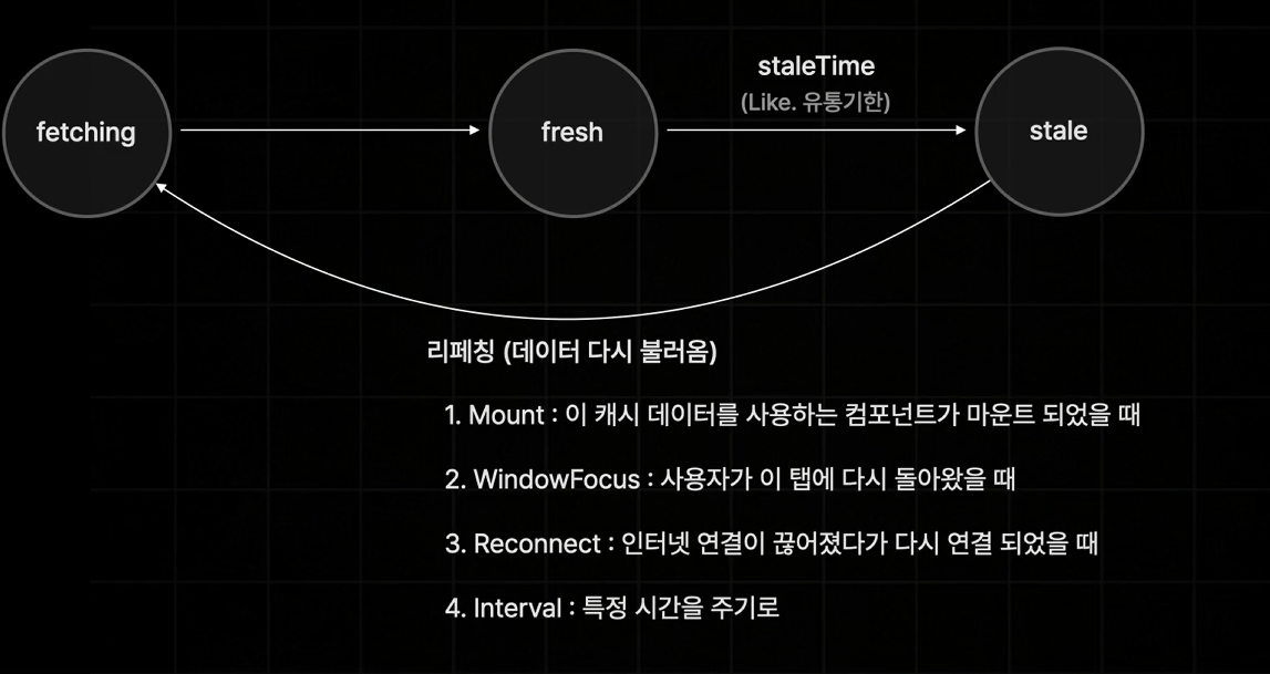 stale 상태에서는 refetching 기능을 통해 데이터를 다시 불러와 fetching 상태로 돌아간다.