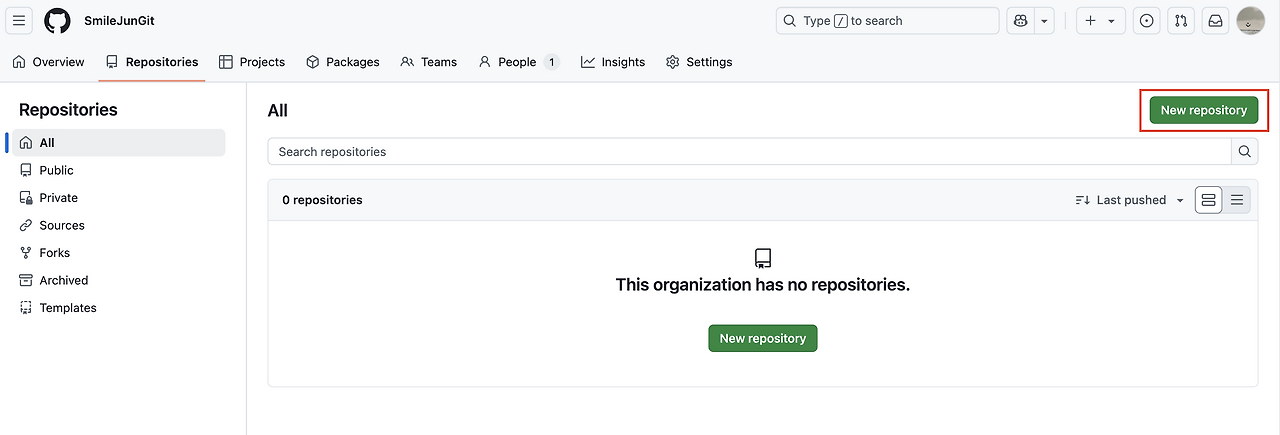 Repositories 창에 들어가서, New repository를 눌러 새로운 repository 생성한다.
