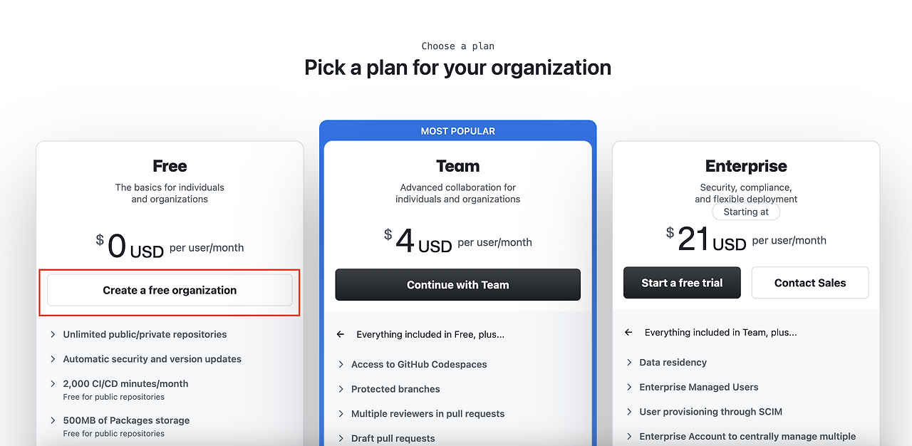 학업용 프로젝트를 위한 organization은 무료이다. 따라서 맨 좌측 Create a free organization을 눌러준다.