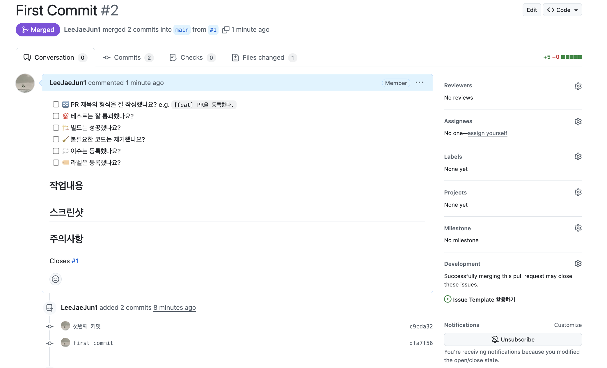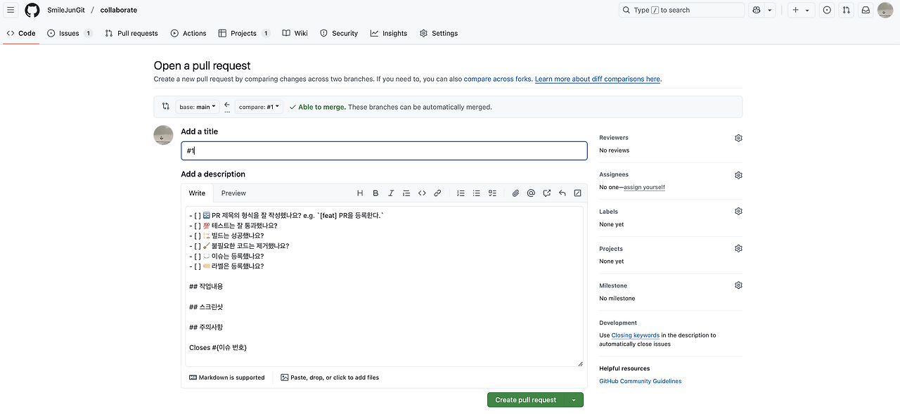 Issue 템플릿과 마찬가지로, Pr을 열게되면 저장된 내용이 자동으로 입력된다. Pr에 대한 내용을 적고, Create pull request를 해주면 된다.