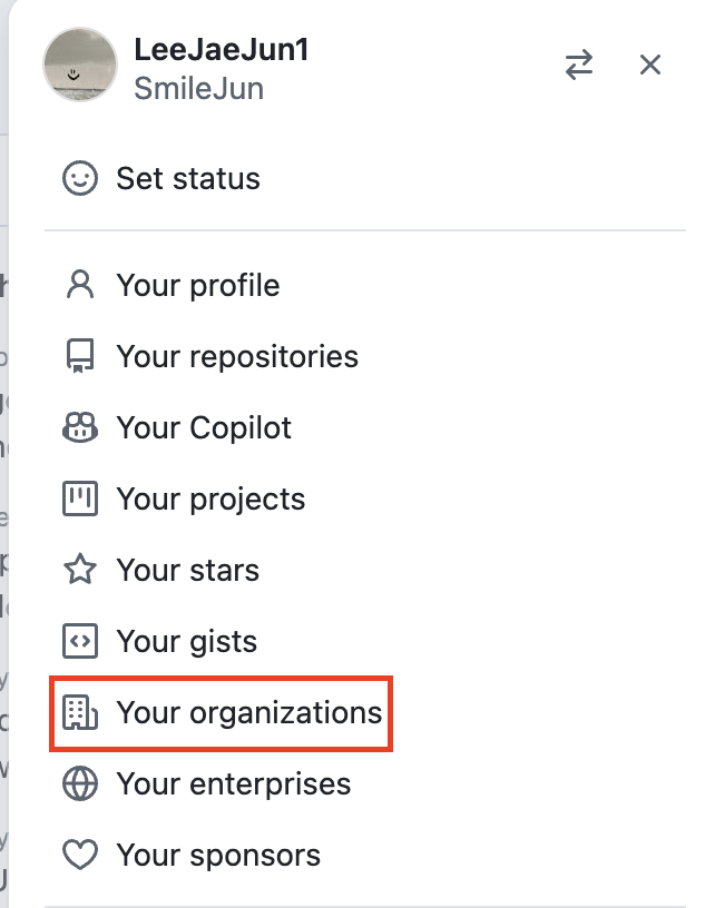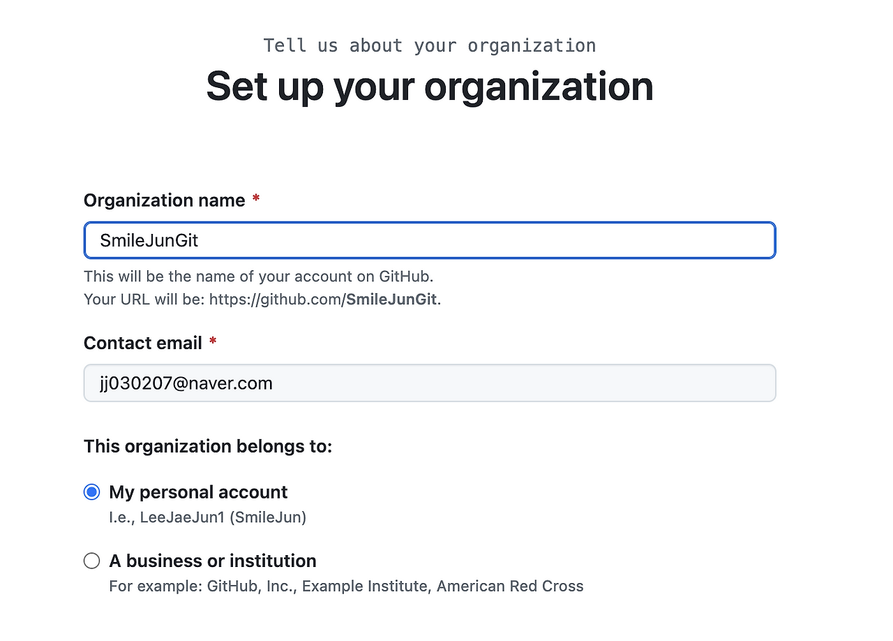 Your organizations에 들어간 뒤, New organization을 눌러서 새로운 organization을 생성한다.