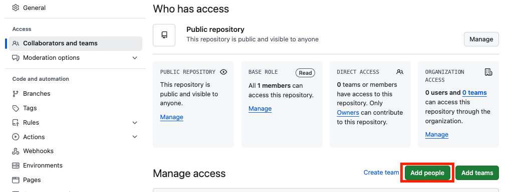 Settings에 들어간 뒤, Collaborators and teams를 누른다.