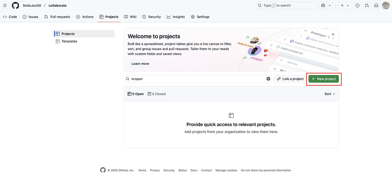 Projects창을 선택한 후, New project를 눌러 새로운 project를 생성한다.