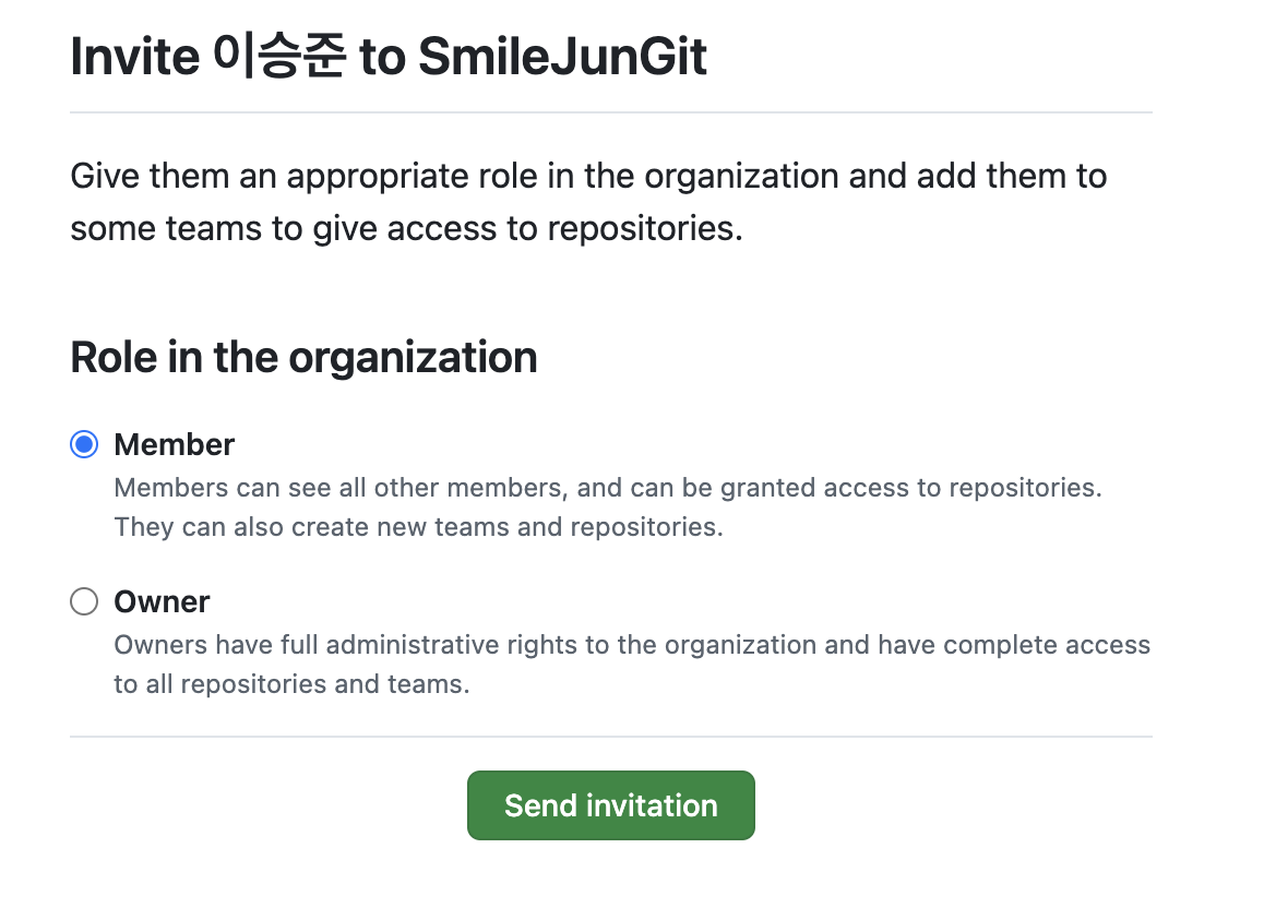 또한 이메일을 발송하기 전, 초대하고자 하는 유저의 권한을 부여할 수 있다. 크게 Member와 Owner가 있다.