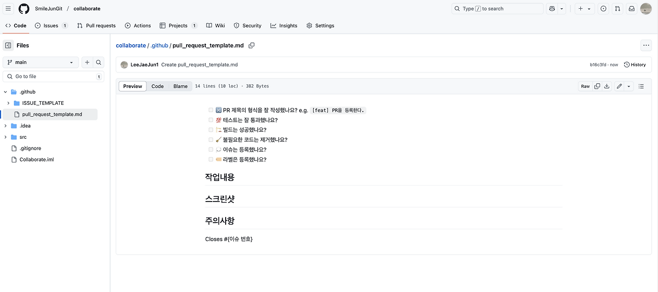 Pr 템플릿은 code에 .github 파일에 직접 추가해야한다. 위의 사진의 예시처럼 pull_reques_template.md라는 파일을 추가하고 원하는 양식을 적어준다.