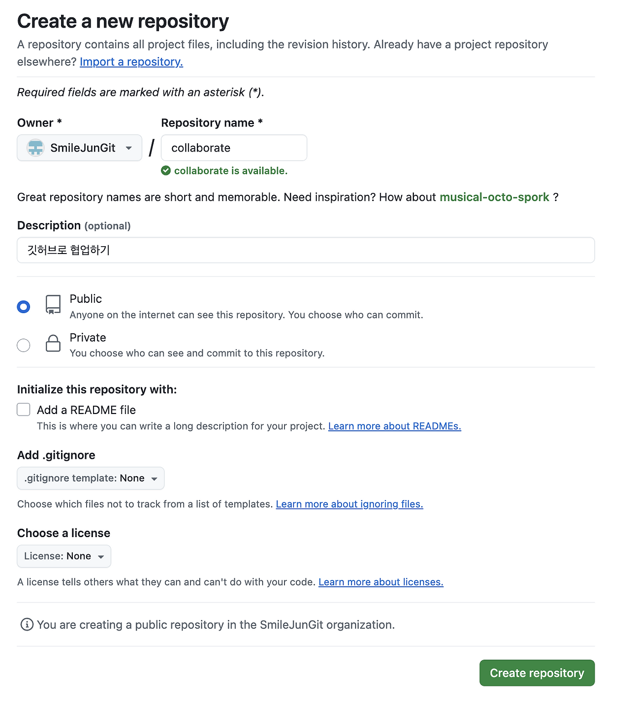 해당 Repository name, Description, public/private를 결정하고 Create repository를 눌러준다.