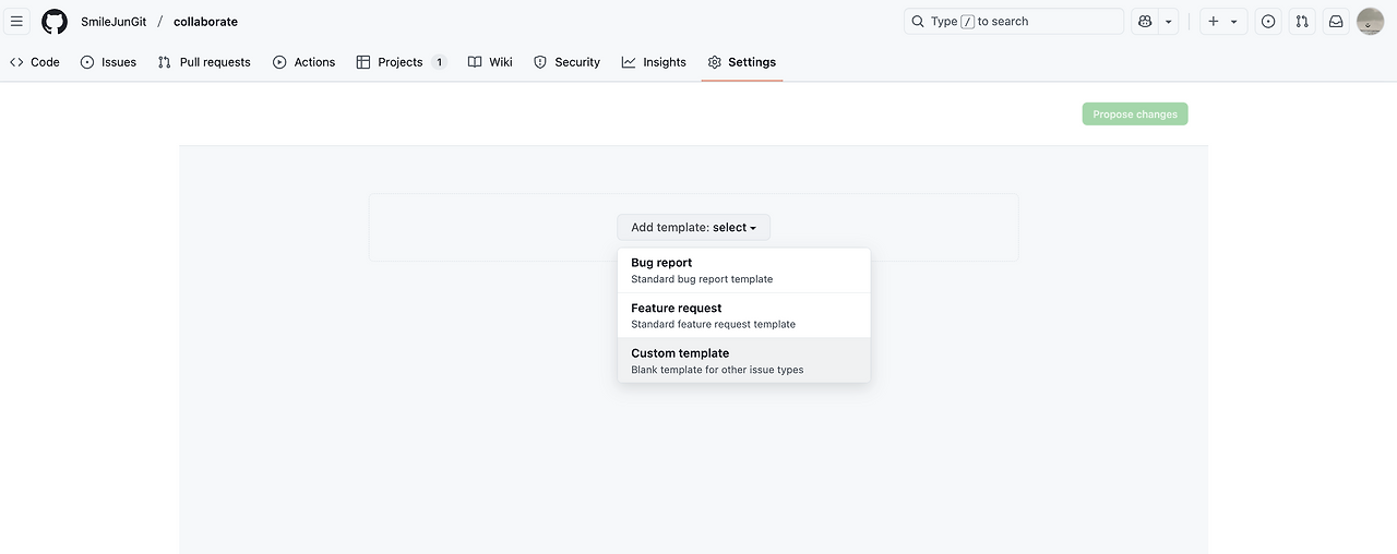Add template : select을 누르면 Bug, Feature, Custom template을 선택할 수 있다. 해당하는 이슈의 template을 각각 설정할 수 있다.