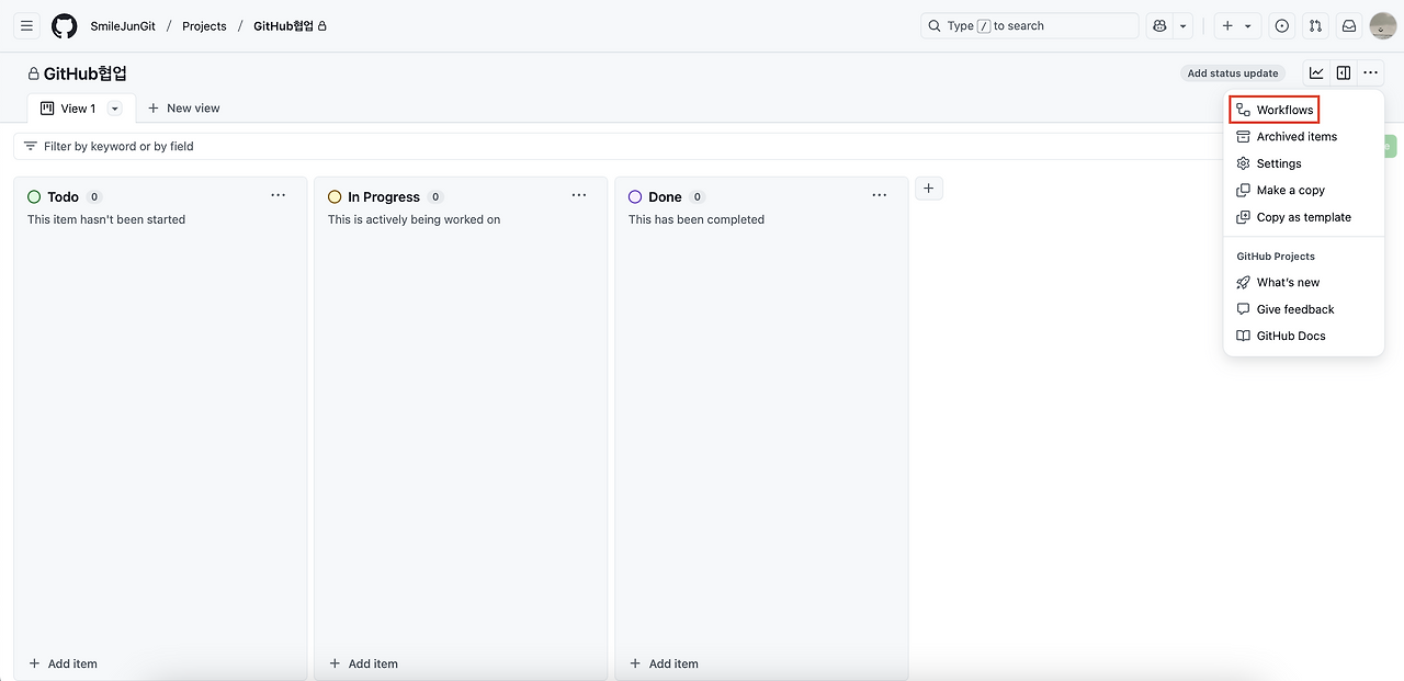 + Add item을 사용해서 수동으로 issue들을 추가할 수도 있지만, Workflows를 사용하여 자동으로 issue들을 관리할 수도 있다.