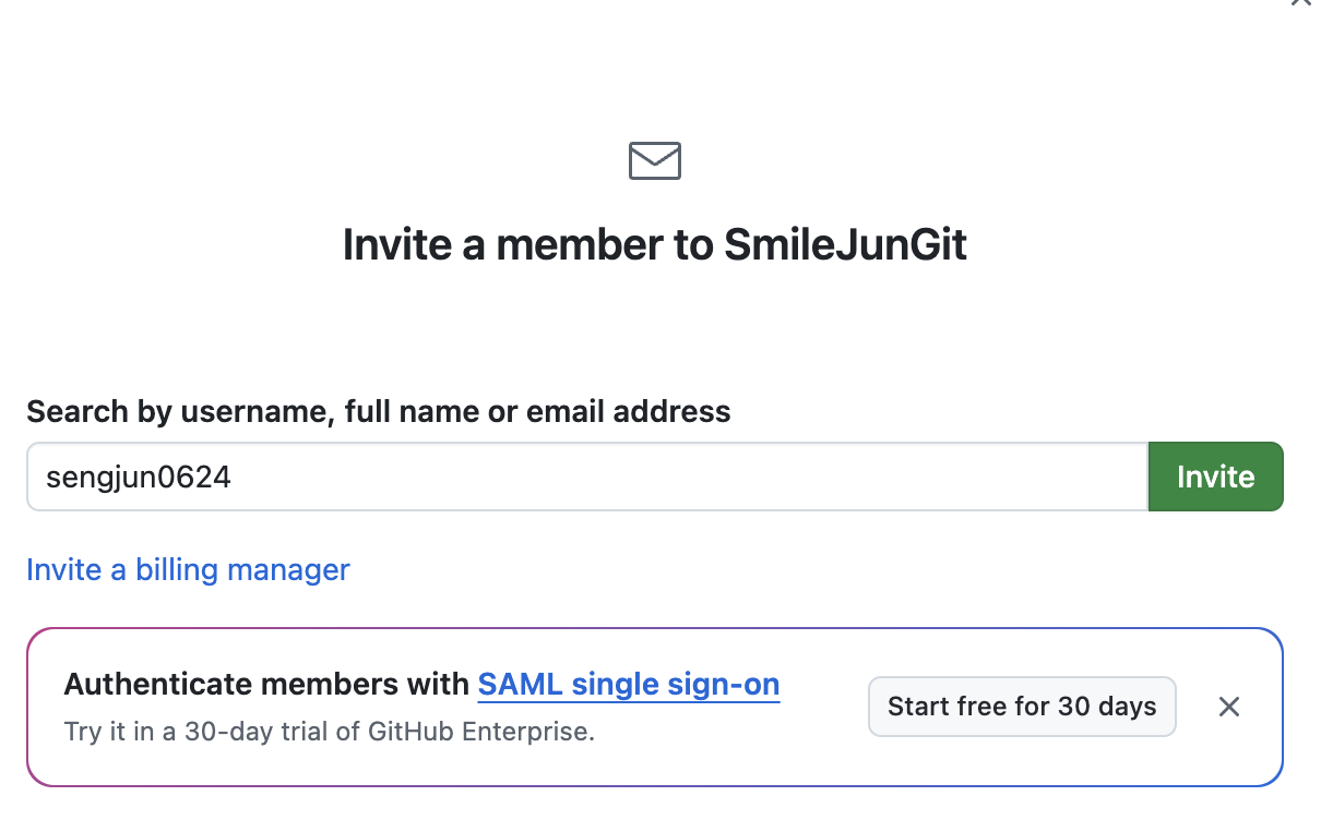 Organization을 만든 뒤, People 창에 들어가서 Invite member를 누르면 다른 유저를 초대할 수 있다. 해당 유저의 깃허브 아이디나 이메일을 작성하면 초대 이메일이 발송된다.