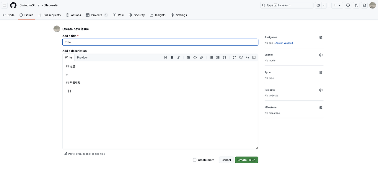 이렇게 이슈를 생성하려고 할 때, 만든 템플릿을 사용하게 되면 저장된 내용들이 자동으로 입력된다.