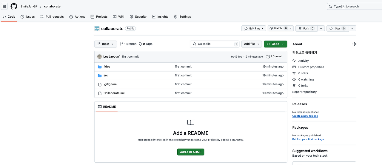 해당 화면은 Github와 IntellJ를 연동시킨 뒤, 초기 commit을 한 상태이다.