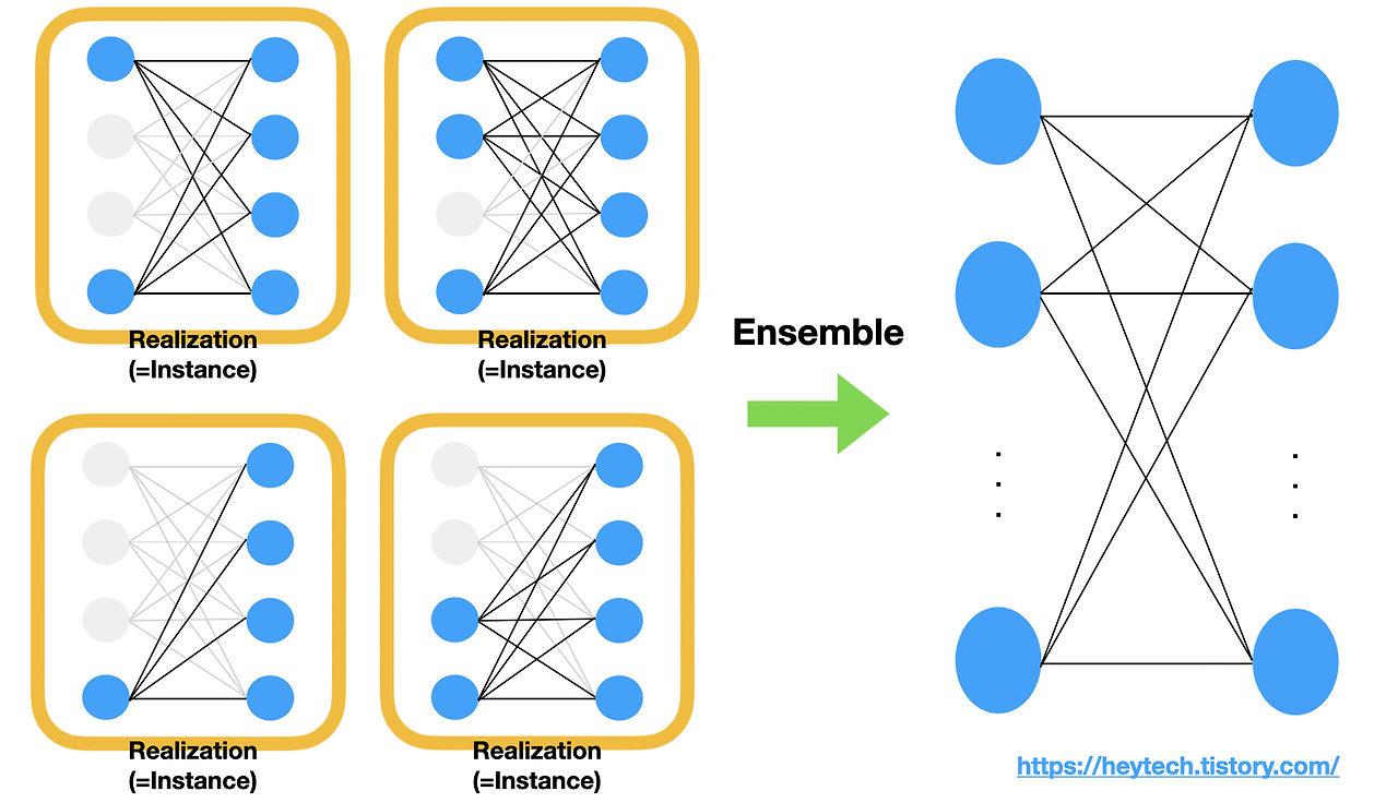 • 특정한 설명변수 Feature만을 과도하게 집중하여 학습함으로써 발생할 수 있는 과대적합(Overfitting)을 방지하기 위해 사용된다. Drop-out이 적용된 전결합계층을 하나의 Realization(=Instance)라고 한다. 각 realization이 일부 뉴런만으로 좋은 출력값을 제공할 수 있도록 최적화 되었을 때, 각각의 여러 출력값에 평균을 취하면(=Ensemble) 모든 뉴런을 사용한 전결합계층의 출력값을 얻을 수 있습니다. 이 출력값은 편향되지 않은 출력값을 얻는데 효과적이다.