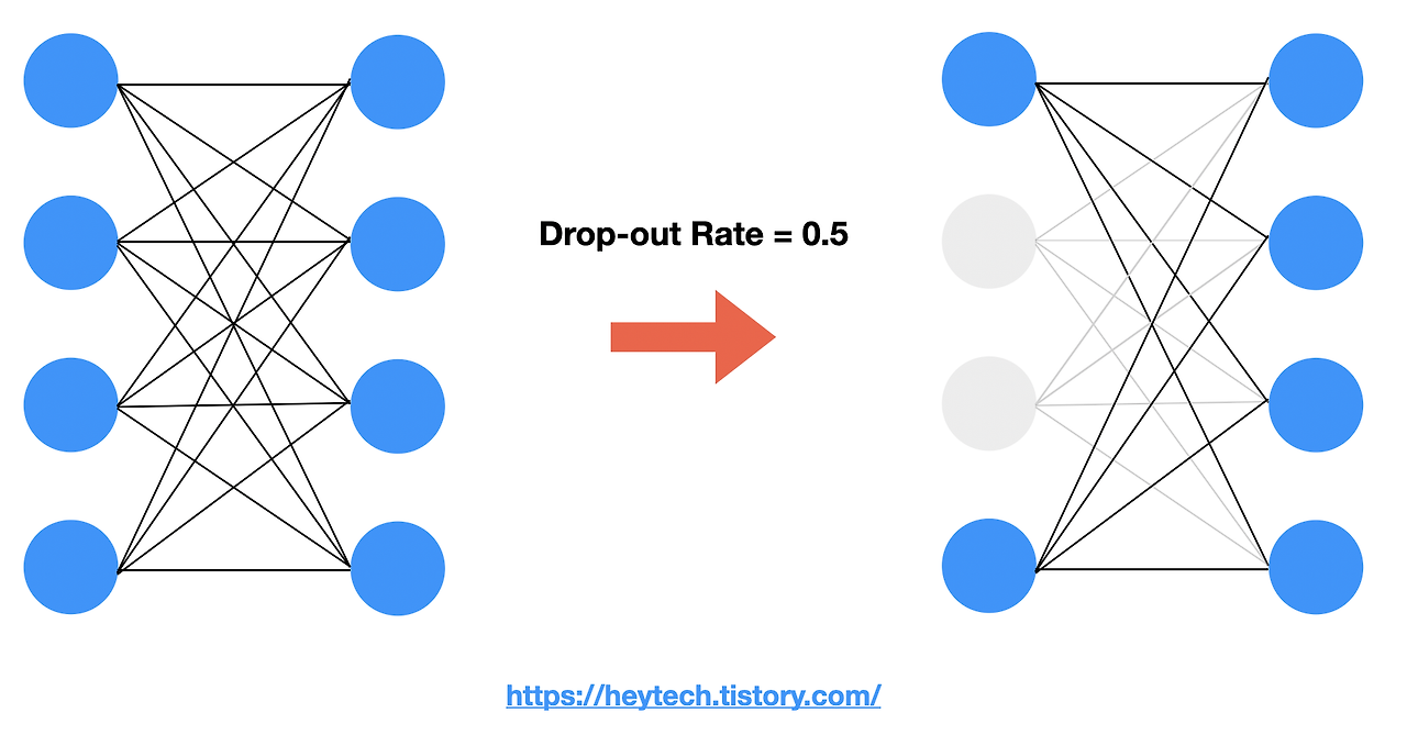 • 무작위로 탈락되는 뉴런의 비율이다. 일반적으로 약 0.2~0.5에서 시작하는 것이 좋다. 탈락률이 너무 낮으면 과적합을 효과적으로 방지할 수 없고, 너무 높으면 학습을 방해한다.