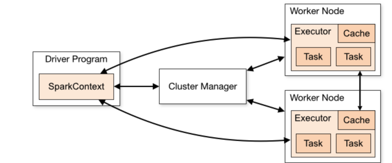 - SparkContext : 스파크 애플리케이션의 진입점(Entry Point) 역할을 하며, 클러스터 관리자와 통신하여 자원을 요청하고 작업 조율