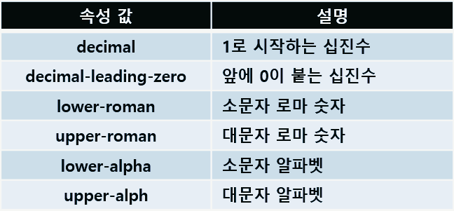 list-style-type : none | <순서 없는 목록의 불릿> | <순서 목록의 번호>