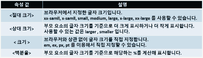 font-size: <절대 크기> | <상대 크기> | <크기> | <백분율>