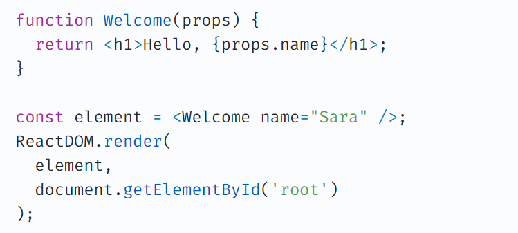 위의 코드를 보면 element에 Welcome을 담고 있음. Welcome은 부모인 element에 있는 Sara를 props에 담아 내려받고 사용