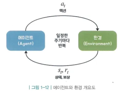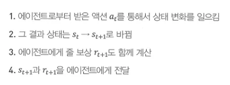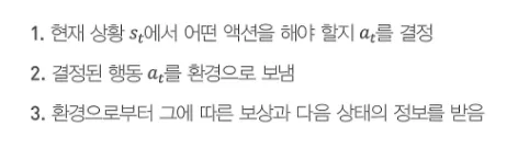 강화 학습에서는 학습 주체인 에이전트와 그것을 둘러싼 환경이 상호작용하며 학습이 진행됨.
