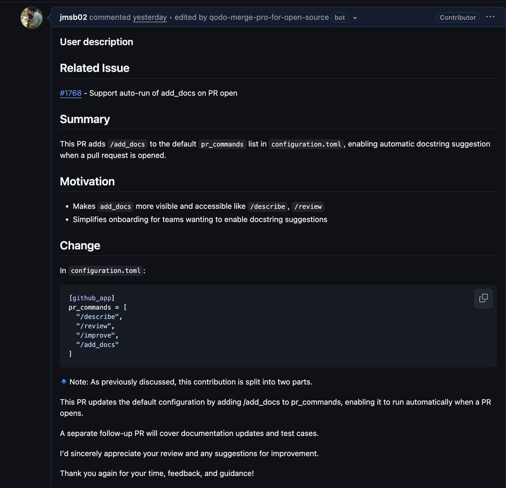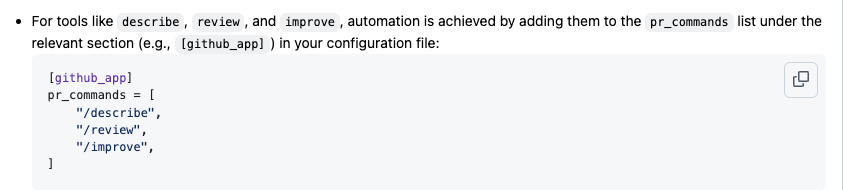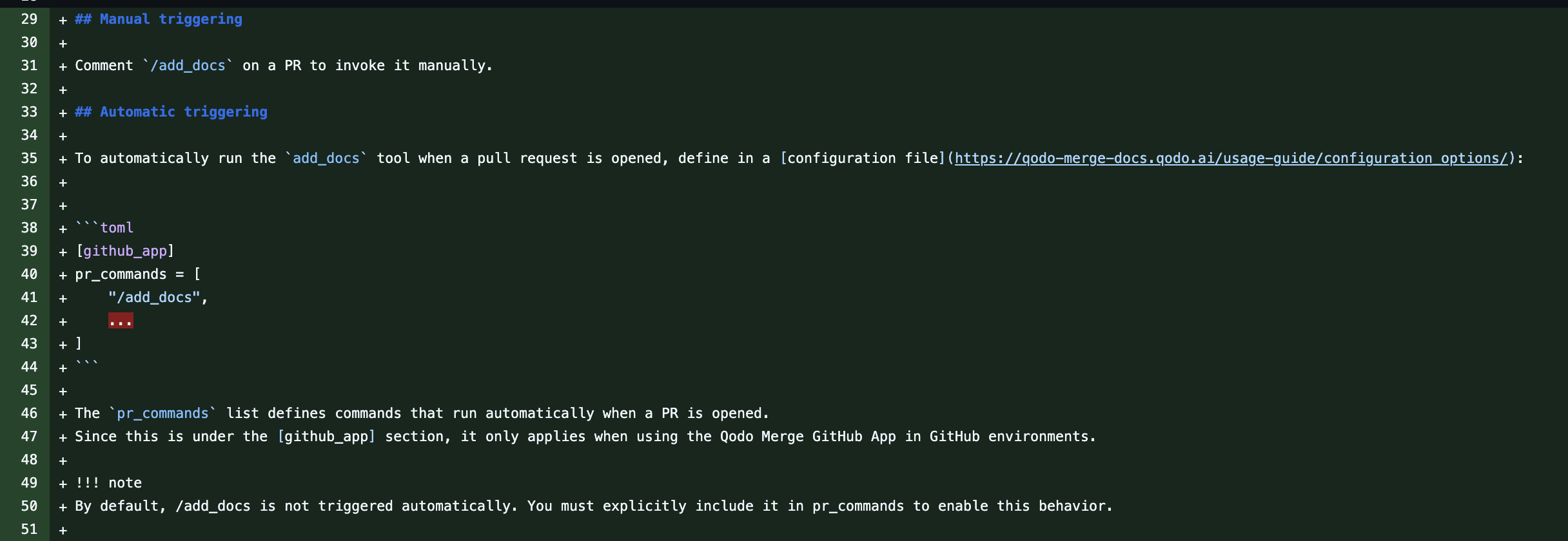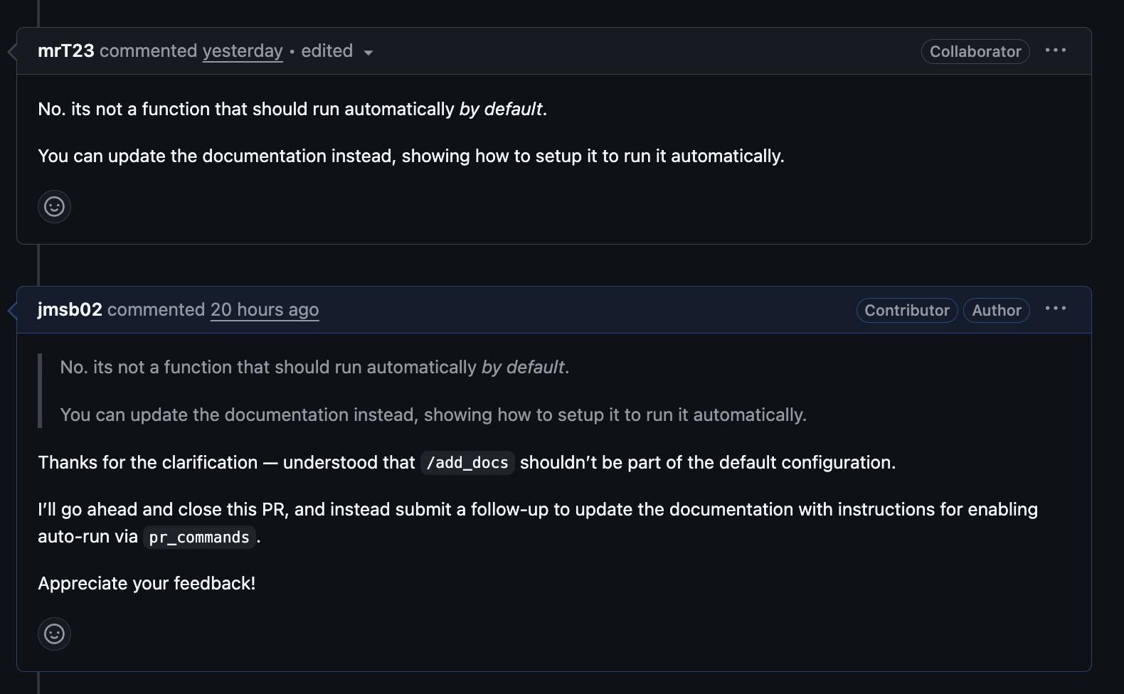 하지만 리뷰를 통해 알게된 사실은, 이미 기존의 pr_commands 설정에 /add_docs를 포함시키기만 해도 자동으로 실행된다는 것이었다.