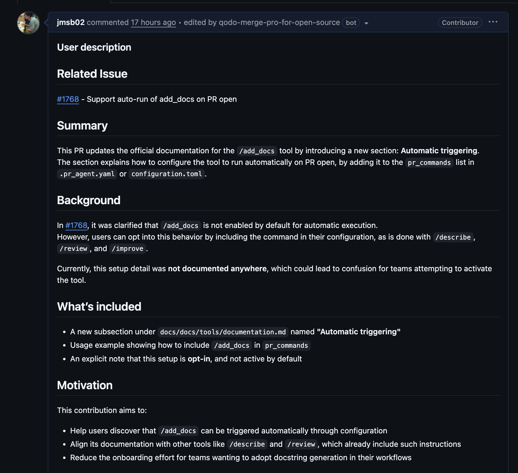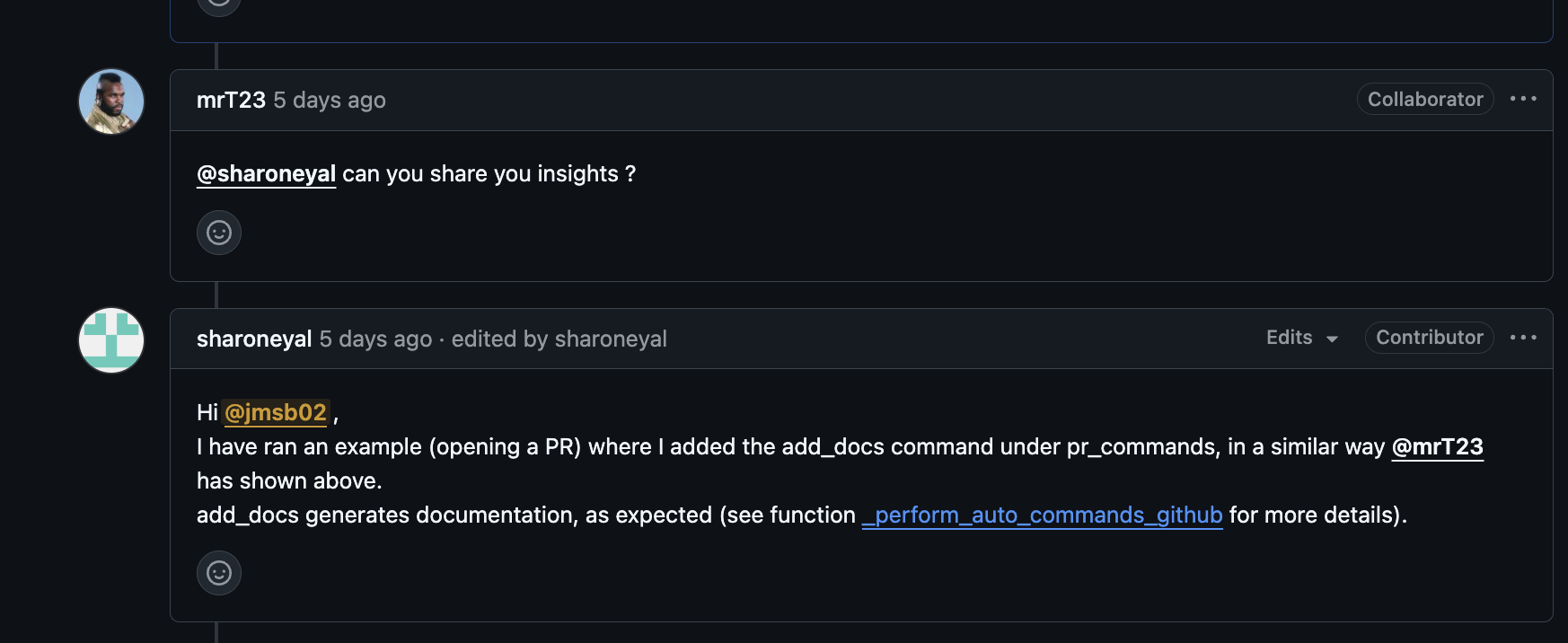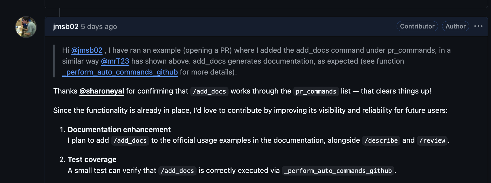 하지만 리뷰를 통해 알게된 사실은, 이미 기존의 pr_commands 설정에 /add_docs를 포함시키기만 해도 자동으로 실행된다는 것이었다.