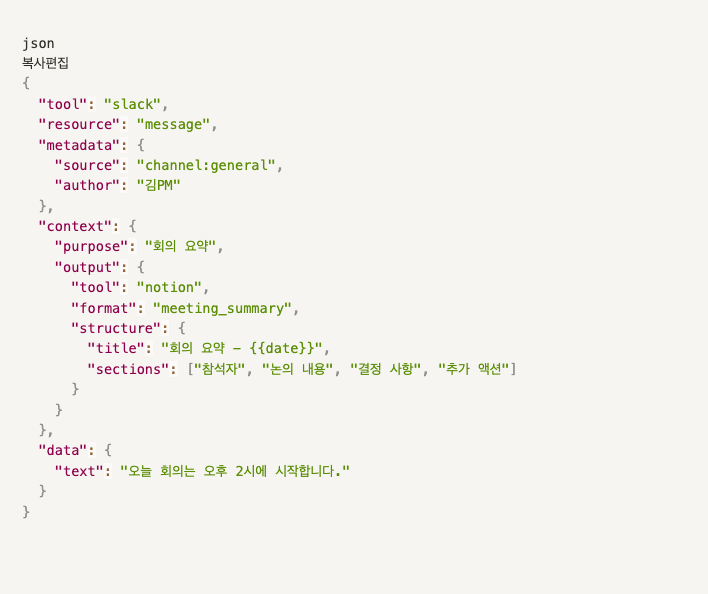"슬랙에서 온 회의 메세지구나", "요약이 필요하구나", "노션에 작성하면 되겠네" 등 사람이 스스로 설명하는 것이 아닌 AI가 스스로 문맥을 이해하여 적절한 행동을 할 수 있다!